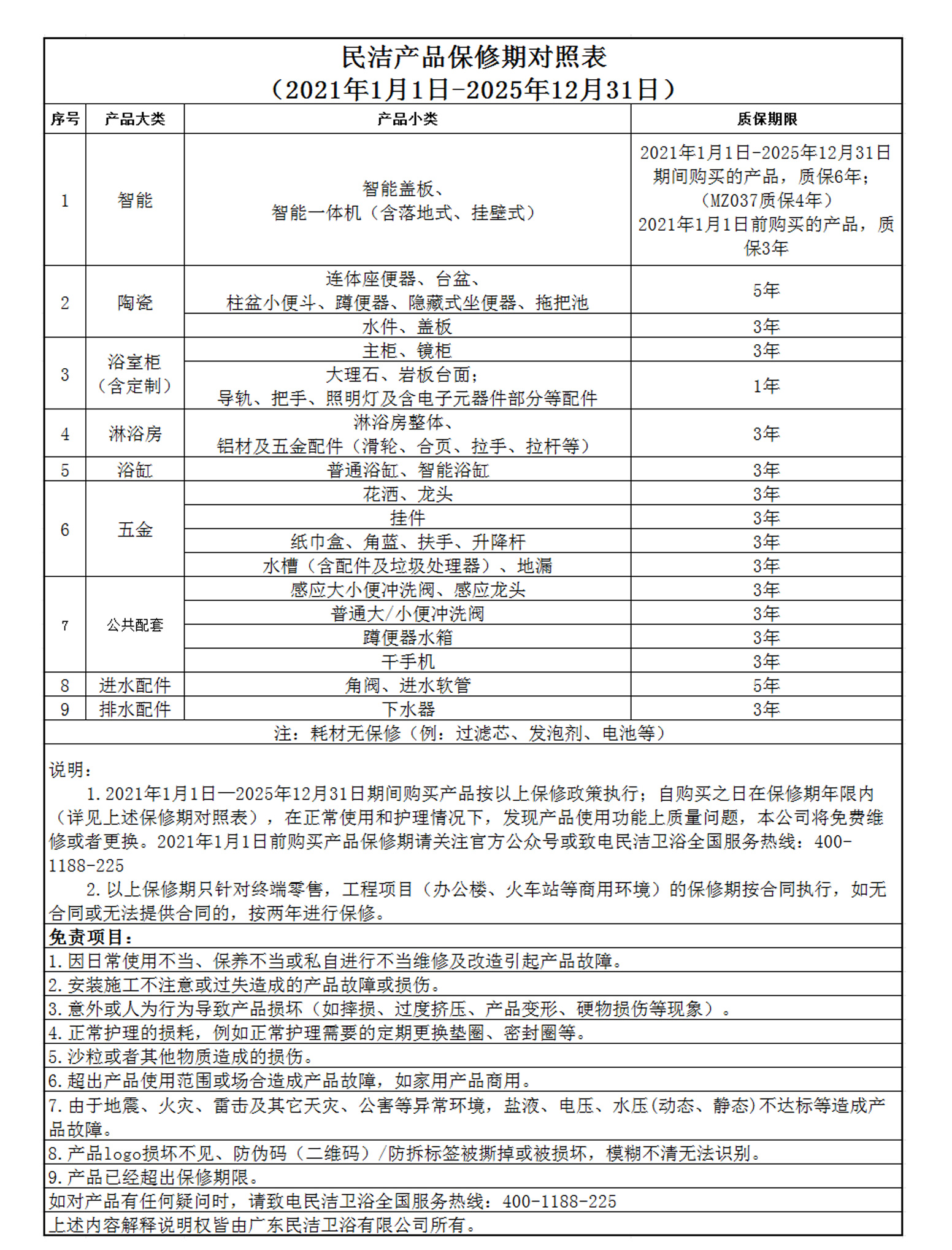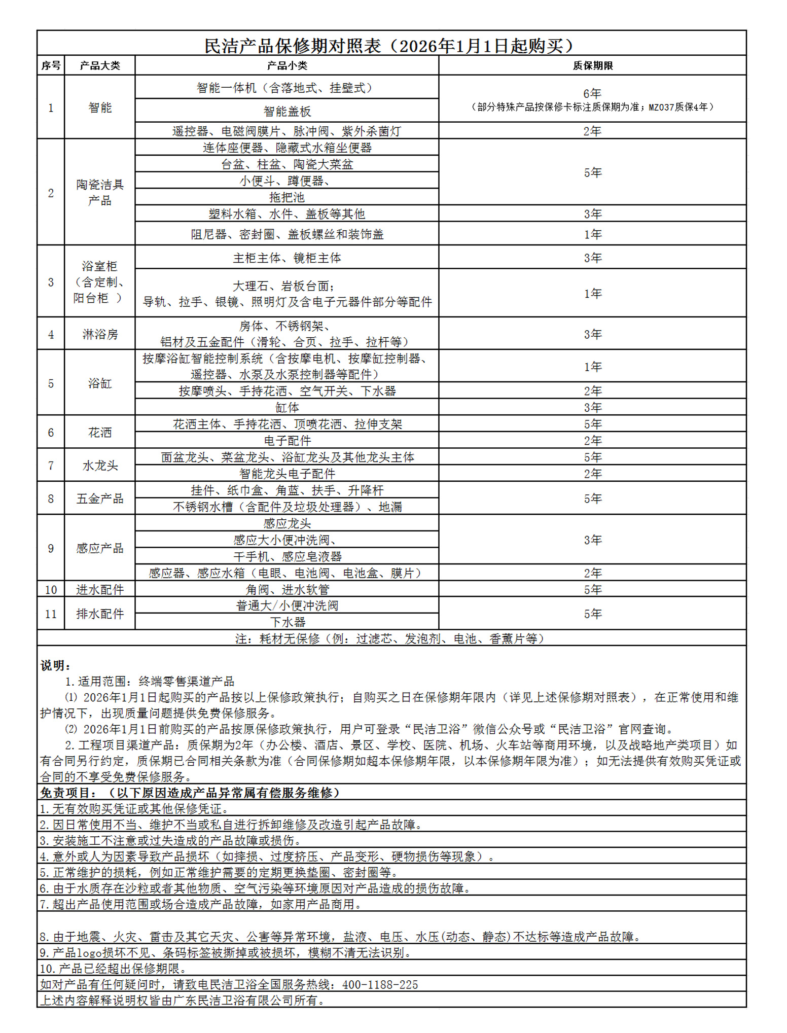 1.保修期:消费者自购买民洁卫浴产品之日起开始计算产品保修期。各品类产品保修期详见附件:《保修期对照表》。